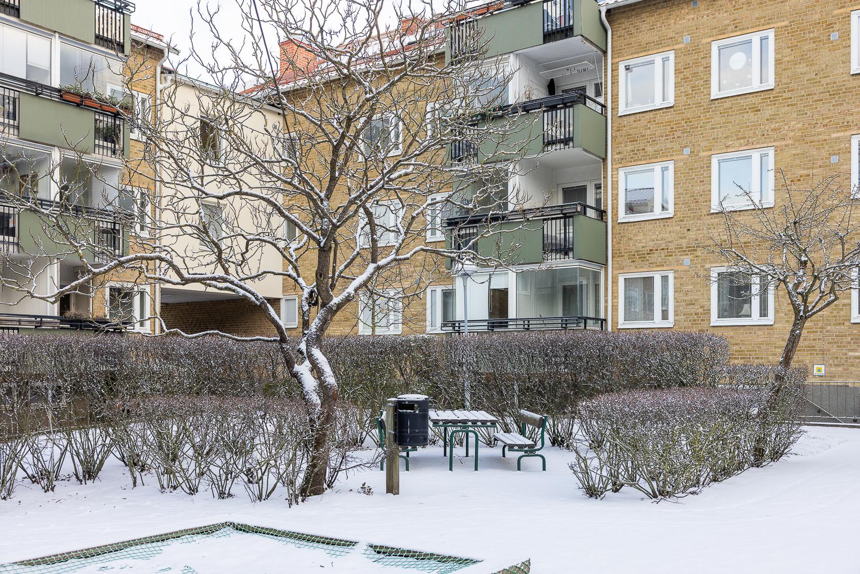 Föreningen har en härlig innergård med gräsmattor, rosenbuskar, stenbelagda uteplatser, utemöbler, sandlåda och gungor.